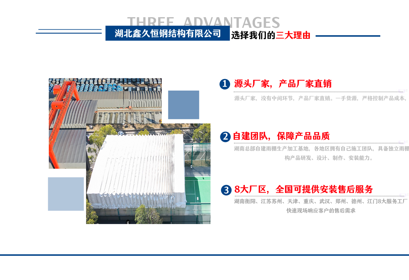 湖北鑫久恒鋼結(jié)構(gòu)有限公司是一家電動(dòng)雨棚、膜結(jié)構(gòu)車(chē)棚研發(fā),生產(chǎn)銷(xiāo)售,施工安裝于一體的專(zhuān)業(yè)鋼結(jié)構(gòu)科技公司,主要產(chǎn)品有伸縮雨棚,電動(dòng)雨棚,膜結(jié)構(gòu)車(chē)棚等。  湖南地區(qū)職員目前有80多人,占地面積20000平方米,廠(chǎng)房面積15600平方米,配備先進(jìn)的生產(chǎn)流水線(xiàn),使每件品質(zhì)產(chǎn)品的堅(jiān)實(shí)基礎(chǔ)。  公司在蘇州、天津、重慶、武漢、德州、烏魯木齊、江門(mén)均設(shè)有服務(wù)工廠(chǎng),總?cè)藛T共300多人,擁有專(zhuān)業(yè)的技術(shù)團(tuán)隊(duì),配備先進(jìn)的設(shè)備和流水線(xiàn)生產(chǎn),產(chǎn)能高,貨源充足,發(fā)貨速度快,服務(wù)區(qū)域廣。  移動(dòng)伸縮棚適用于通道臨時(shí)倉(cāng)儲(chǔ)、戶(hù)外運(yùn)動(dòng)遮陽(yáng)、污水池遮蓋、能源交通、熱力化工、礦山、船舶制造及市政建設(shè)、物流、碼頭等領(lǐng)域的構(gòu)件制作加工,成品半成品存放、倉(cāng)庫(kù)、野外儀器設(shè)備操作用房等。尤其是對(duì)工廠(chǎng)發(fā)貨、倉(cāng)儲(chǔ)臨時(shí)遮雨防嗮,梅雨期較長(zhǎng)、建設(shè)周期較短的工程施工等特別適用。還可根據(jù)用戶(hù)需求量身定制、適合企業(yè)所需不同款式的產(chǎn)品。  我公司堅(jiān)持“誠(chéng)信社會(huì)為本,客戶(hù)滿(mǎn)意為榮”的經(jīng)營(yíng)理念,做到質(zhì)量把控,嚴(yán)格管理,精益求精,恪守承諾。使鑫久恒逐步走向成熟,其系統(tǒng)化、專(zhuān)業(yè)化日趨完善。以專(zhuān)業(yè)的技術(shù)、科學(xué)的管理,更高的產(chǎn)品質(zhì)量,優(yōu)良的企業(yè)信譽(yù),真誠(chéng)的客戶(hù)服務(wù),靈活多樣的經(jīng)營(yíng)方式和務(wù)實(shí)創(chuàng)新的企業(yè)精神愿與社會(huì)各界攜手合作,為推動(dòng)智能鋼結(jié)構(gòu)建筑事業(yè)的發(fā)展而不斷努力。...